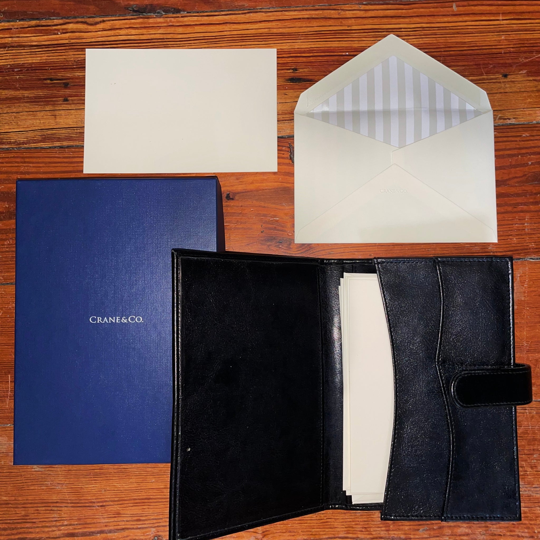 A sleek 6” x 8” black Crane & Co. leather portfolio with 5 correspondence cards and 5 lined envelopes — perfect for organized, elegant letter writing on the go.