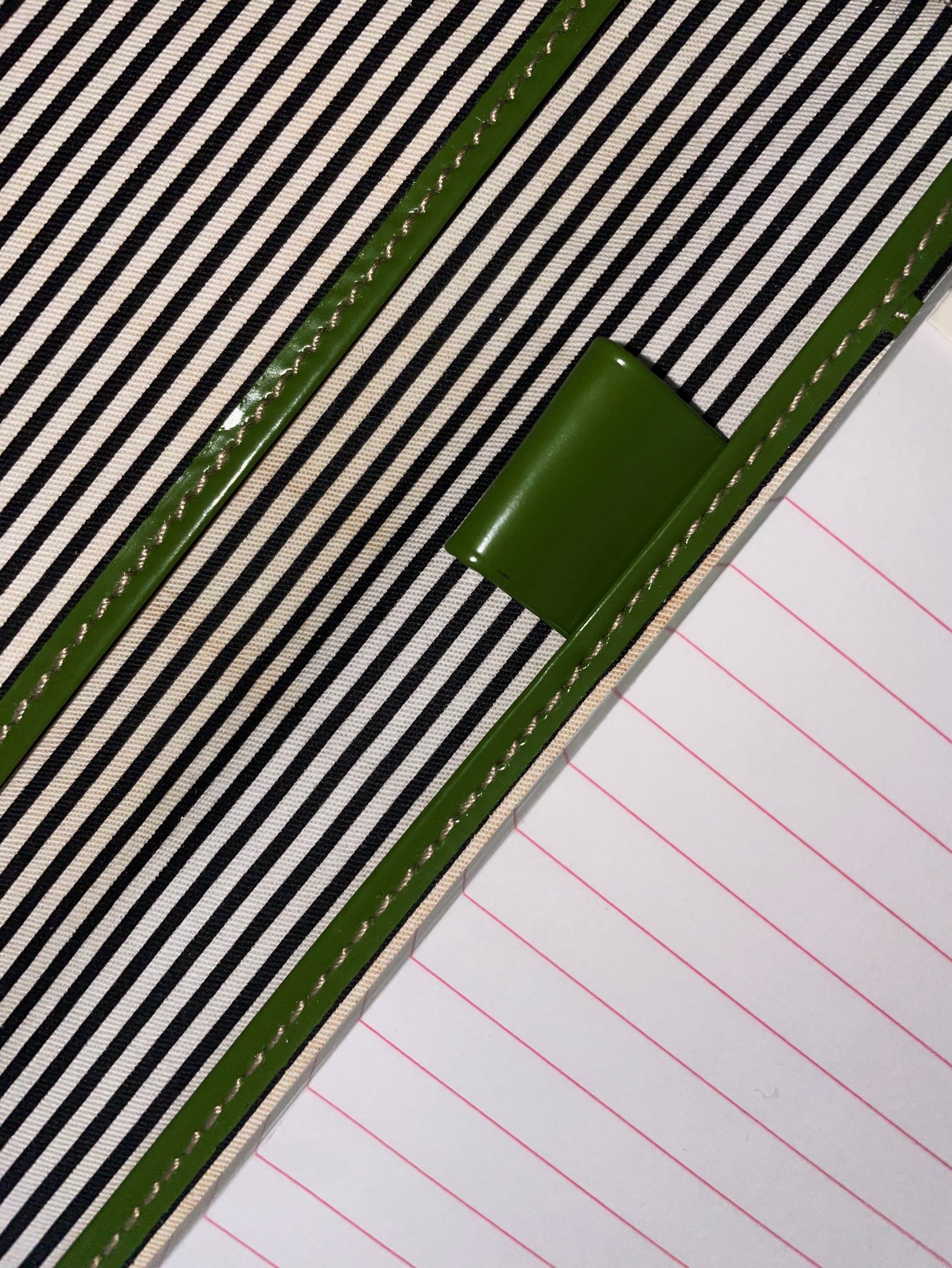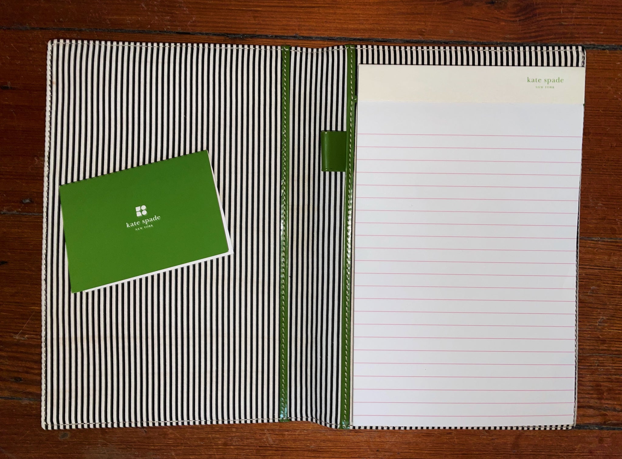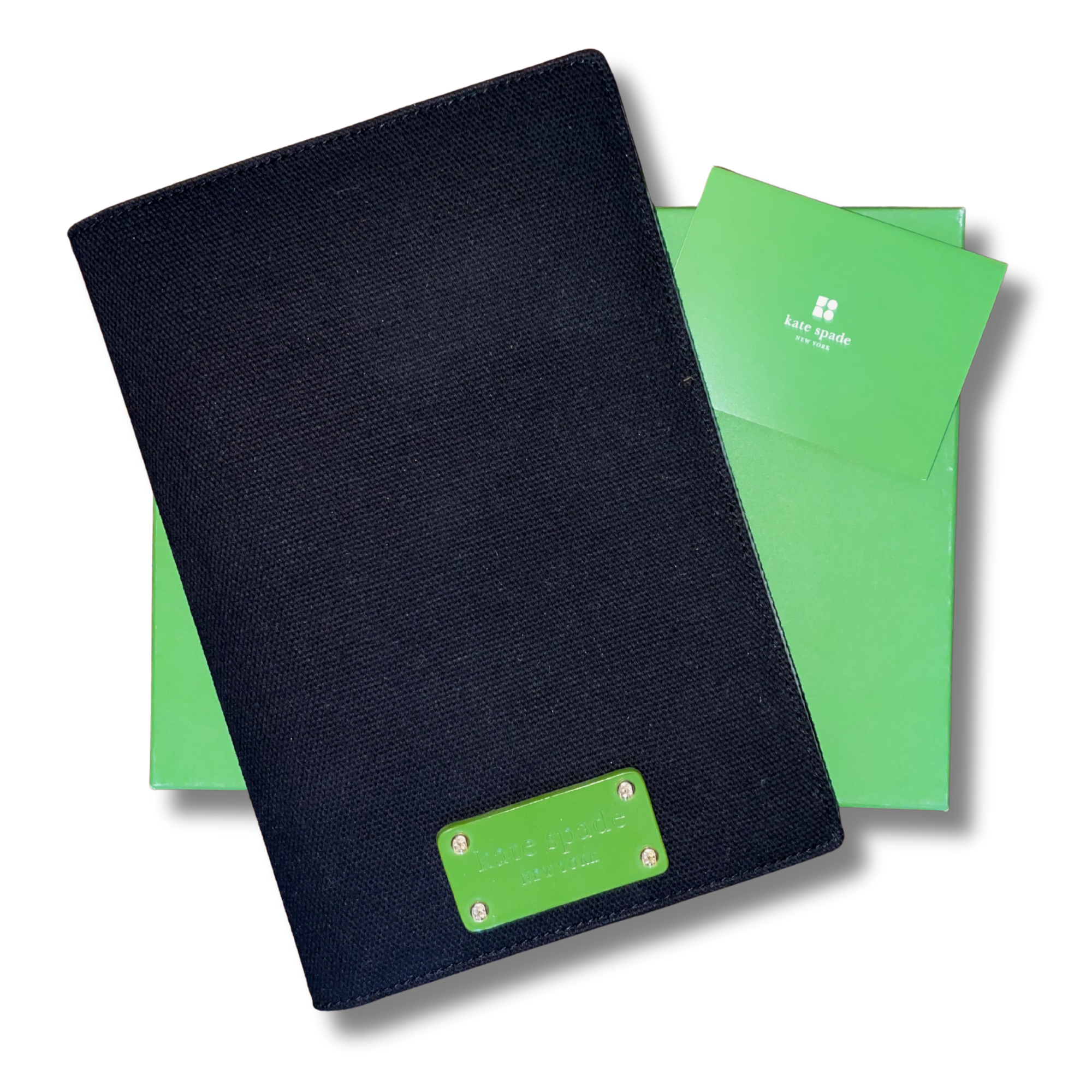 Stay stylishly organized with this vintage Kate Spade New York notebook folio, featuring a sleek black canvas cover, striped interior, matching notepad, and kelly green accents with crisp pages for jotting down ideas in style.