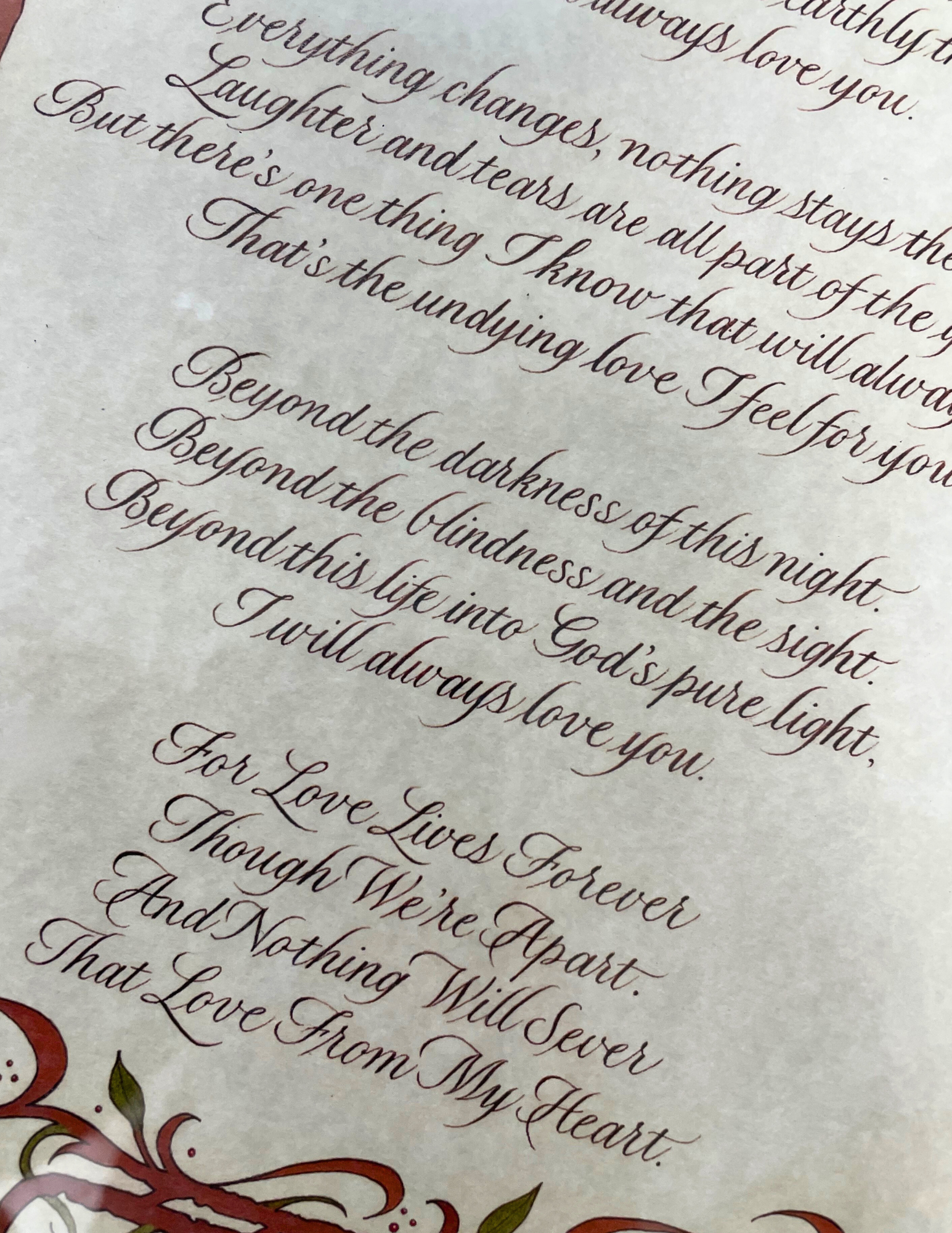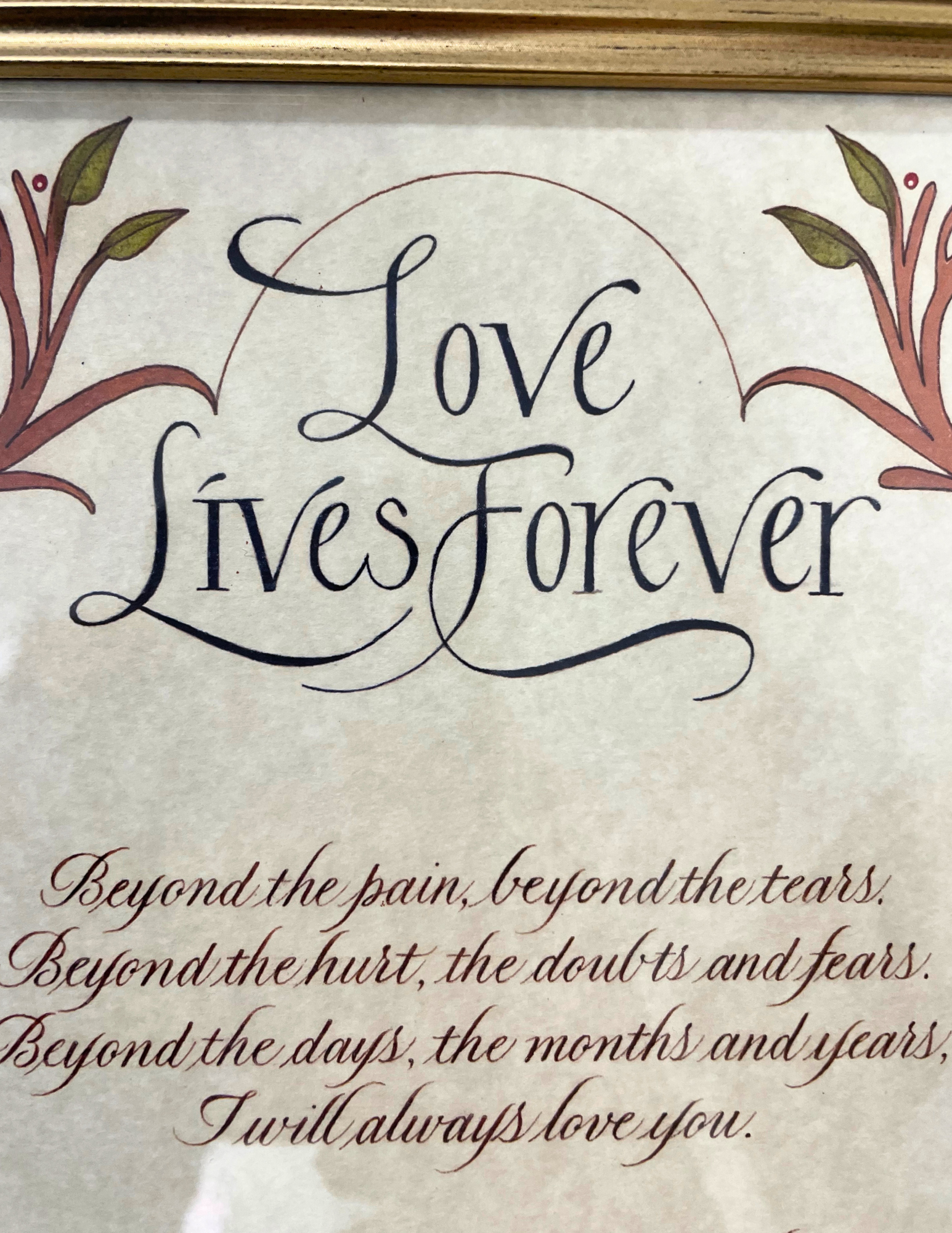 A beautifully framed lyric poster of Love Lives Forever by Glyn Bailey, sung by Lindsay Hamilton. Created to honor the memory of loved ones who have passed, this keepsake includes a complimentary recording of the song — offering comfort, reassurance, and a reminder that love transcends time.